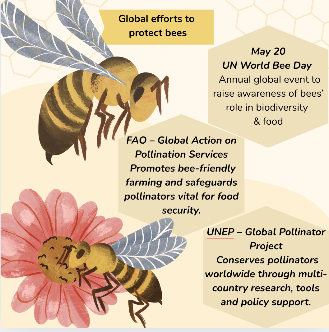 Pollinators are essential for biodiversity, food security and healthy ecosystems. Global initiatives are taking action: UNEP leads research and policy support, FAO promotes bee-friendly farming, UNESCO’s Women for Bees trains and empowers women beekeepers and UN World Bee Day on May 20 raises awareness worldwide. You can help by planting pollinator-friendly plants, avoiding harmful pesticides, supporting sustainable farming, and spreading knowledge to protect bees and ensure a thriving natural world.
