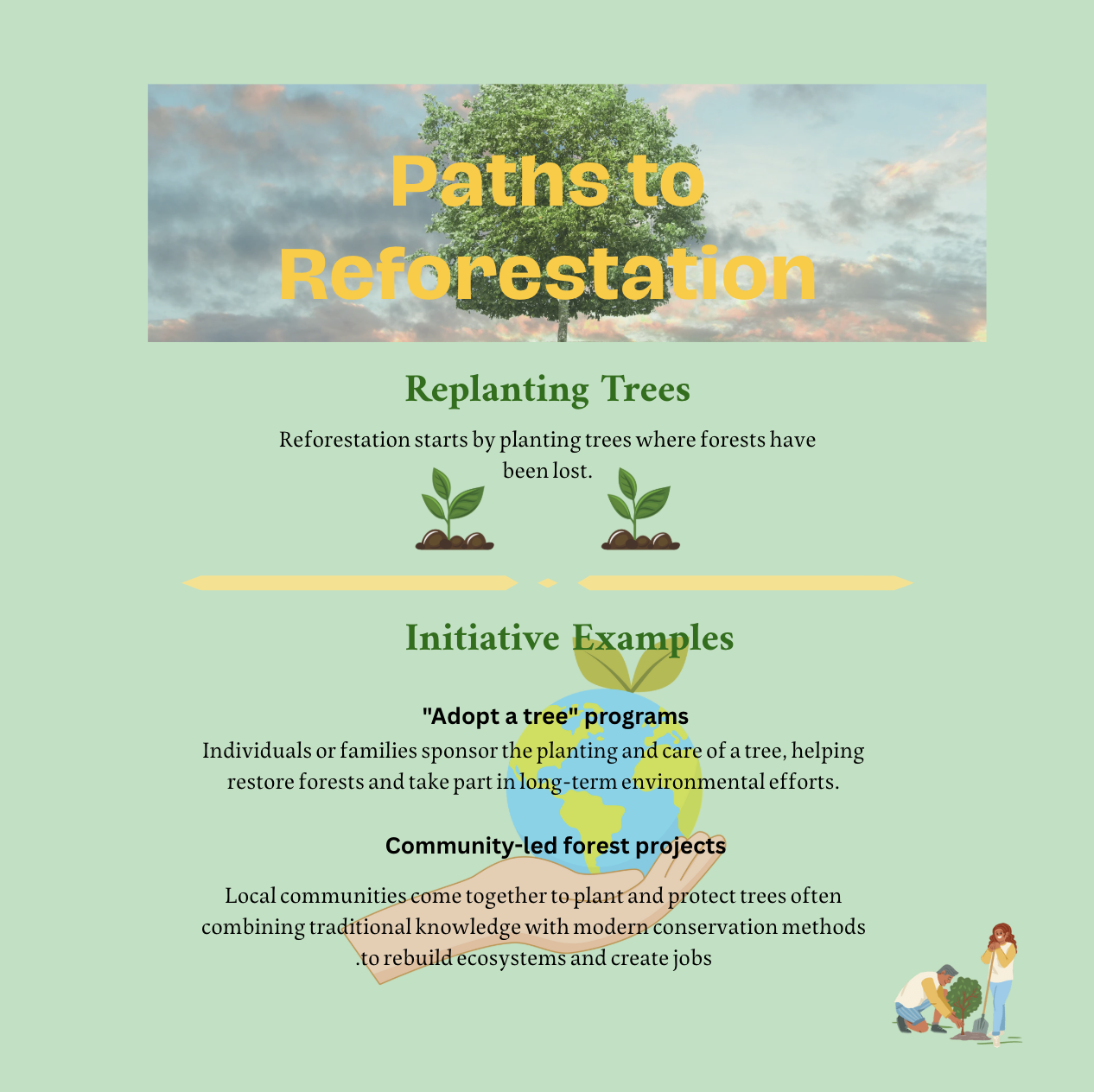 Reforestation can take many forms, from individual efforts to community-wide initiatives. One common path is through "Adopt-a-tree" programs, where individuals or families sponsor the planting and care of a tree playing a direct role in restoring lost forests and supporting long term environmental goals. Another powerful approach is through community led forest projects, in which local communities unite to plant and protect trees. These initiatives often blend traditional knowledge with modern conservation practices, helping not only to rebuild ecosystems but also to create sustainable job opportunities. Together, these efforts highlight how both individuals and groups can actively participate in healing the planet through reforestation.