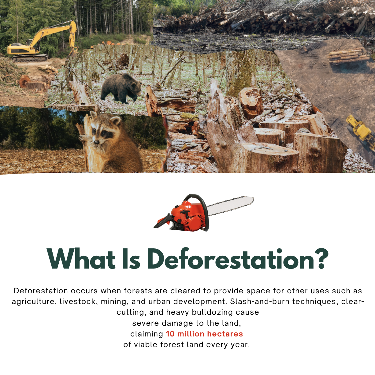 The process of removing trees to allow for industrial and human expansion is known as deforestation. As the human population grows, more forests are cleared each year, often at the expense of our own futures. To protect the livelihoods of 250 million people and 80% of land wildlife that occupy these regions, it is important for us to recognize he dangers posed by deforestation.